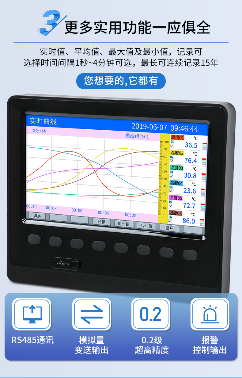 簡要描述:工業無紙記錄儀,6 通道萬能輸入,160*80 面板尺寸。可輸入電流、電壓、熱電偶、熱電阻和頻率等工業信號,以數值、棒和曲線形式實時顯示數據,定時將數據存儲于儀表內部電子存儲器,可通過 USB 設備快速轉存歷史數據。